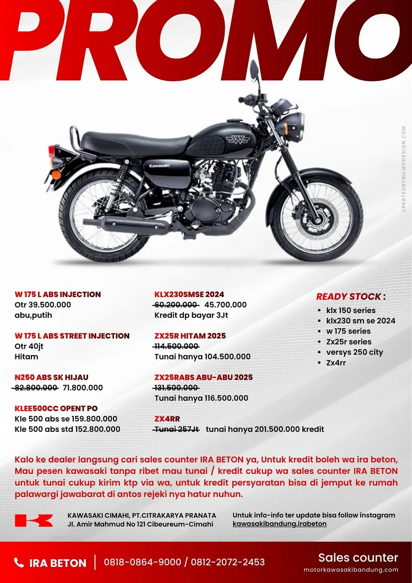 Jangan sampai kelewat PROMO SPECIAL yang diberikan oleh KAWASAKI BANDUNG, untuk memastikan promo dan program-program menarik lainnya, klik tombol dibawah ini untuk dapatkan informasi terupdate seputar PROMO KAWASAKI BANDUNG!